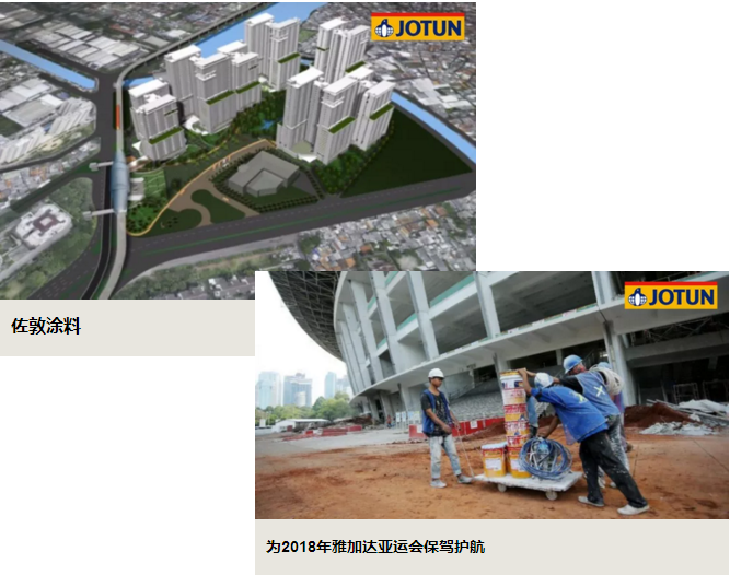 此次中标项目包括格罗拉蓬卡诺国家体育场、10幢亚运村公寓大厦等亚运会设施。作为全球领先的涂料供应商,佐敦为此次亚运会设施提供包括装饰漆、工业保护涂料、粉末涂料在内的"一站式解决方案"。